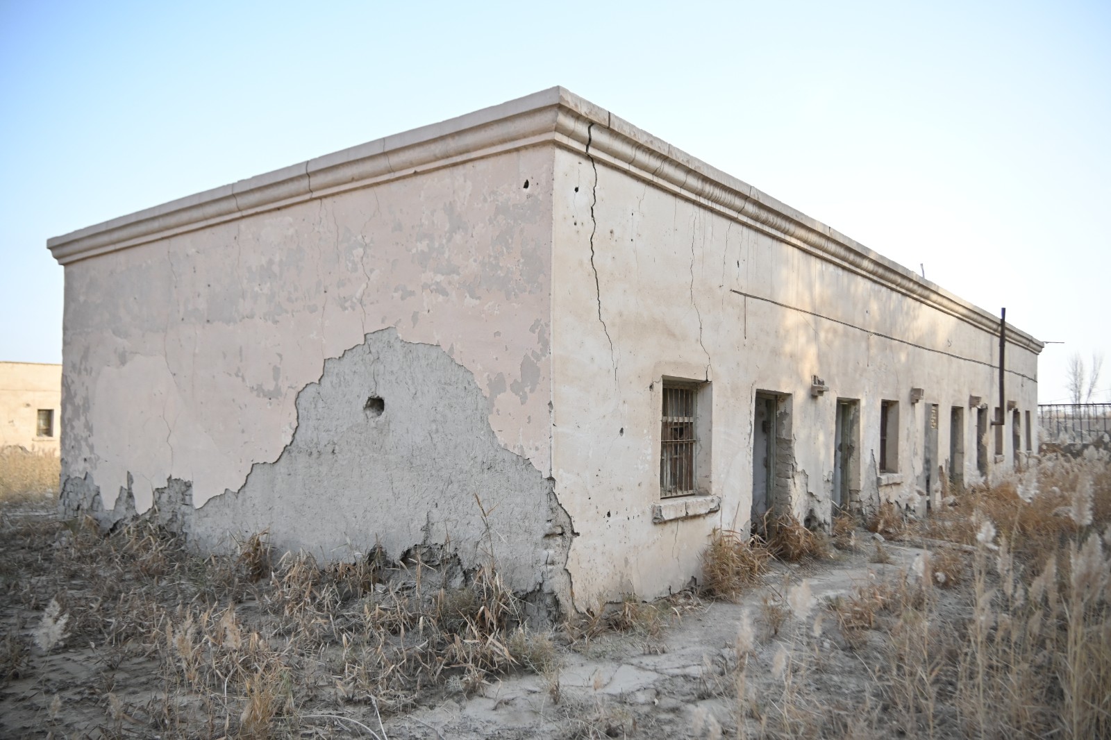 学校旧址两排建筑占地面积约为1238平方米:南排5间窑洞,建筑面积260平方米;北排窑洞,建筑面积165平方米。均为砖砌墙体,扎草拌泥面屋顶,檐口均为砖砌,形制规整,简约大气。据当地老人所讲,在此地选择此种建筑形式,是利用窑洞冬暖夏凉的特点,来应对新疆沙漠干旱少雨的气候条件。两排建筑整体保存较差,屋顶塌陷,墙砖掉落,墙面倒塌和歪闪严重,局部已缺失,室内外堆放大量教具,亟待整治。